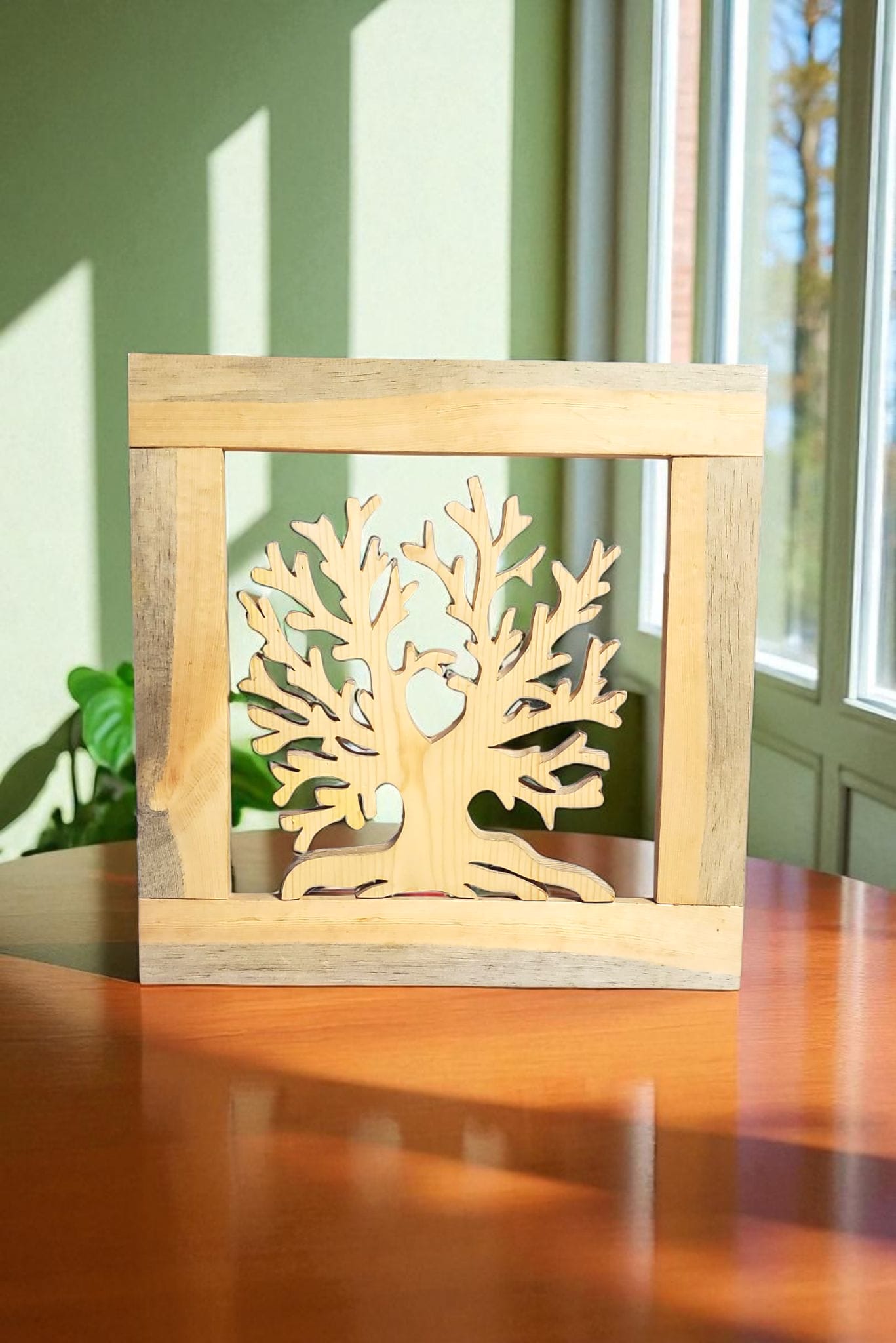 Cuadro artesanal elaborado completamente en madera con diseño calado de árbol de la vida. Tallado con precisión y trabajado a mano, destaca por su acabado natural y su estilo limpio. El marco de madera clara resalta la silueta del árbol y aporta un aire rústico y armonioso, ideal para espacios con decoración natural, espiritual o minimalista.
