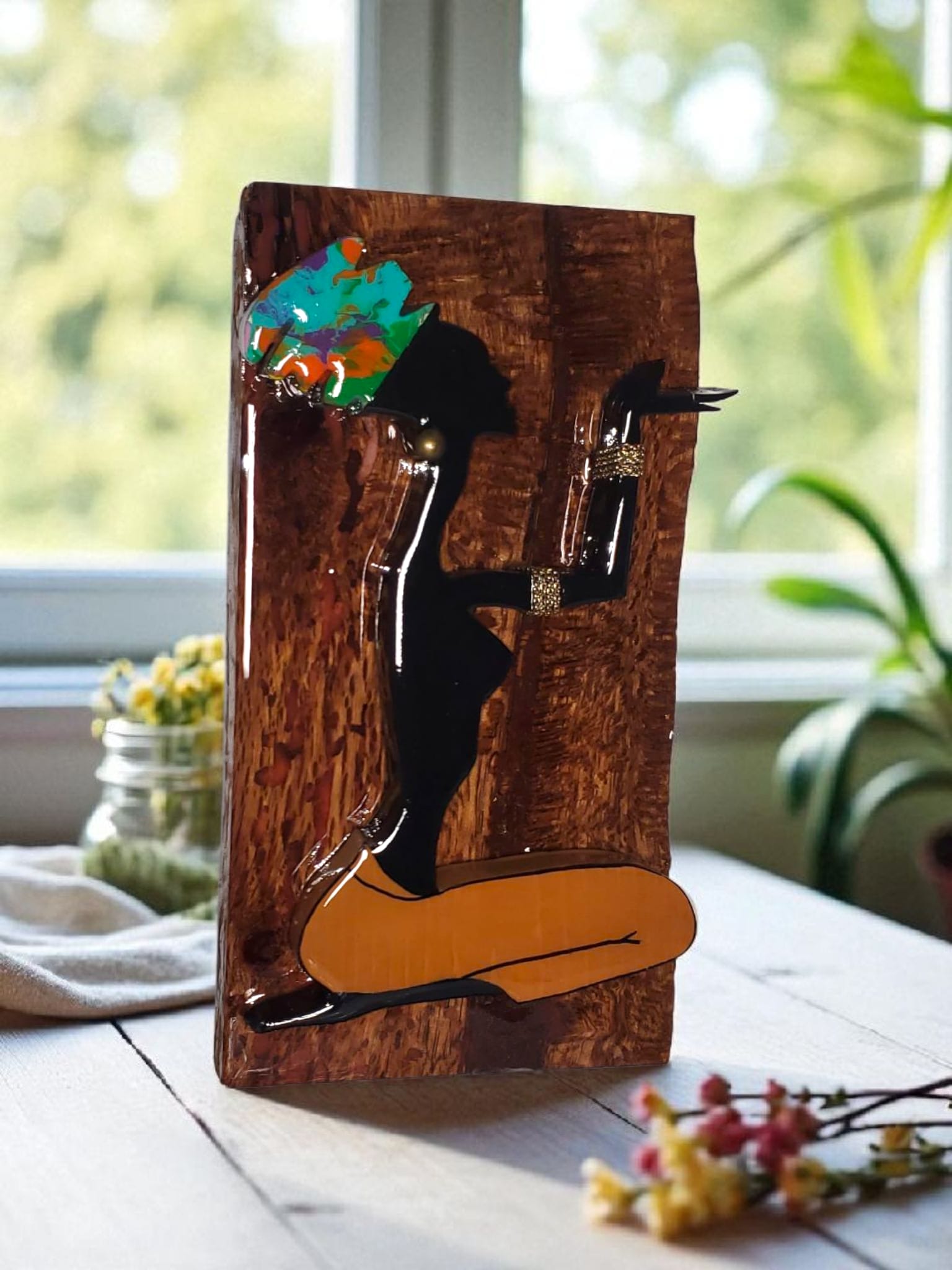 Cuadro artesanal de gallo hecho a mano en madera con un diseño colorido y en relieve. Cada detalle del gallo está trabajado con resina epóxica, que resalta sus colores vibrantes y le da un brillo elegante. El marco es de madera natural, aportando un toque rústico y moderno a la pieza.