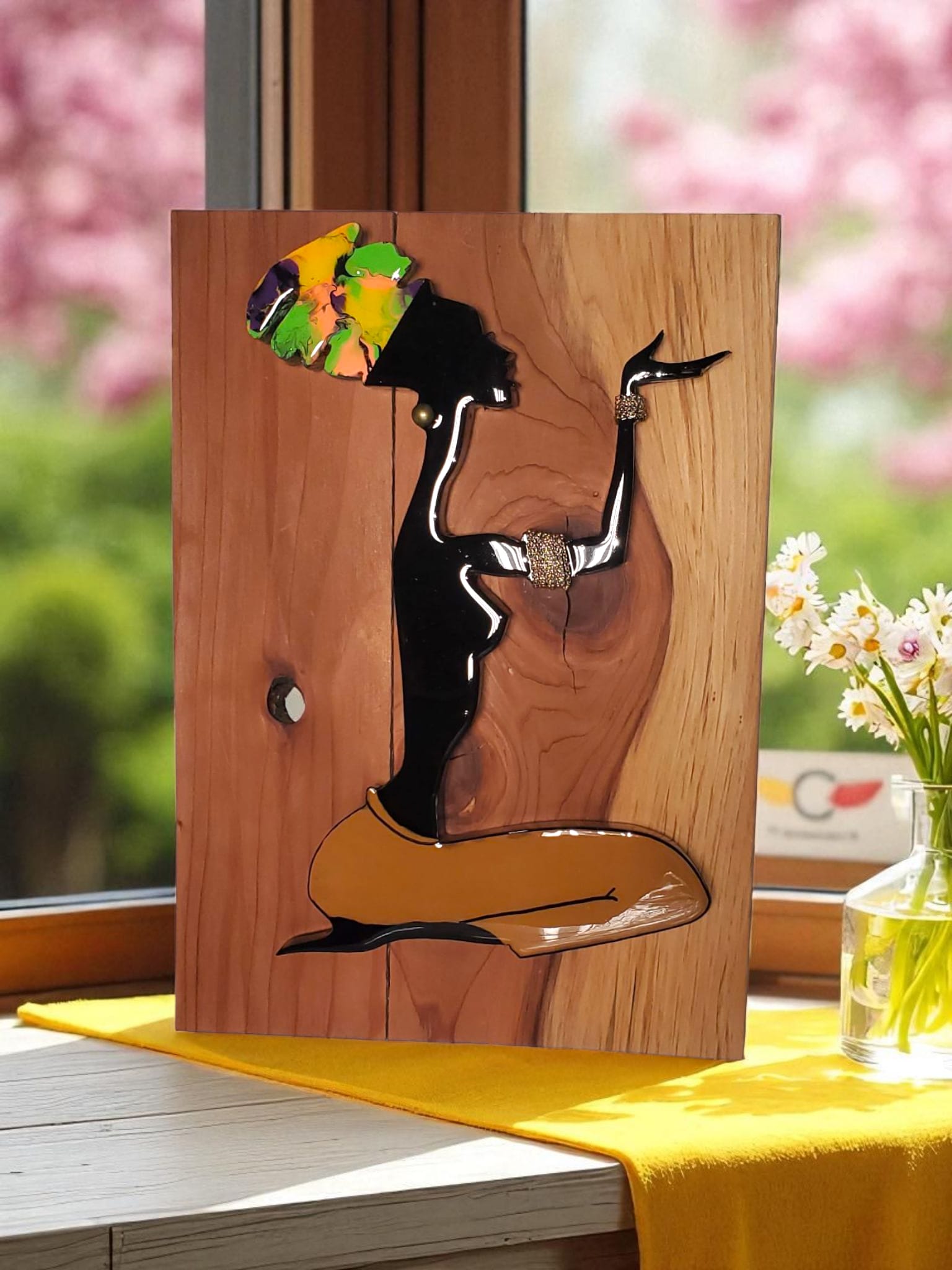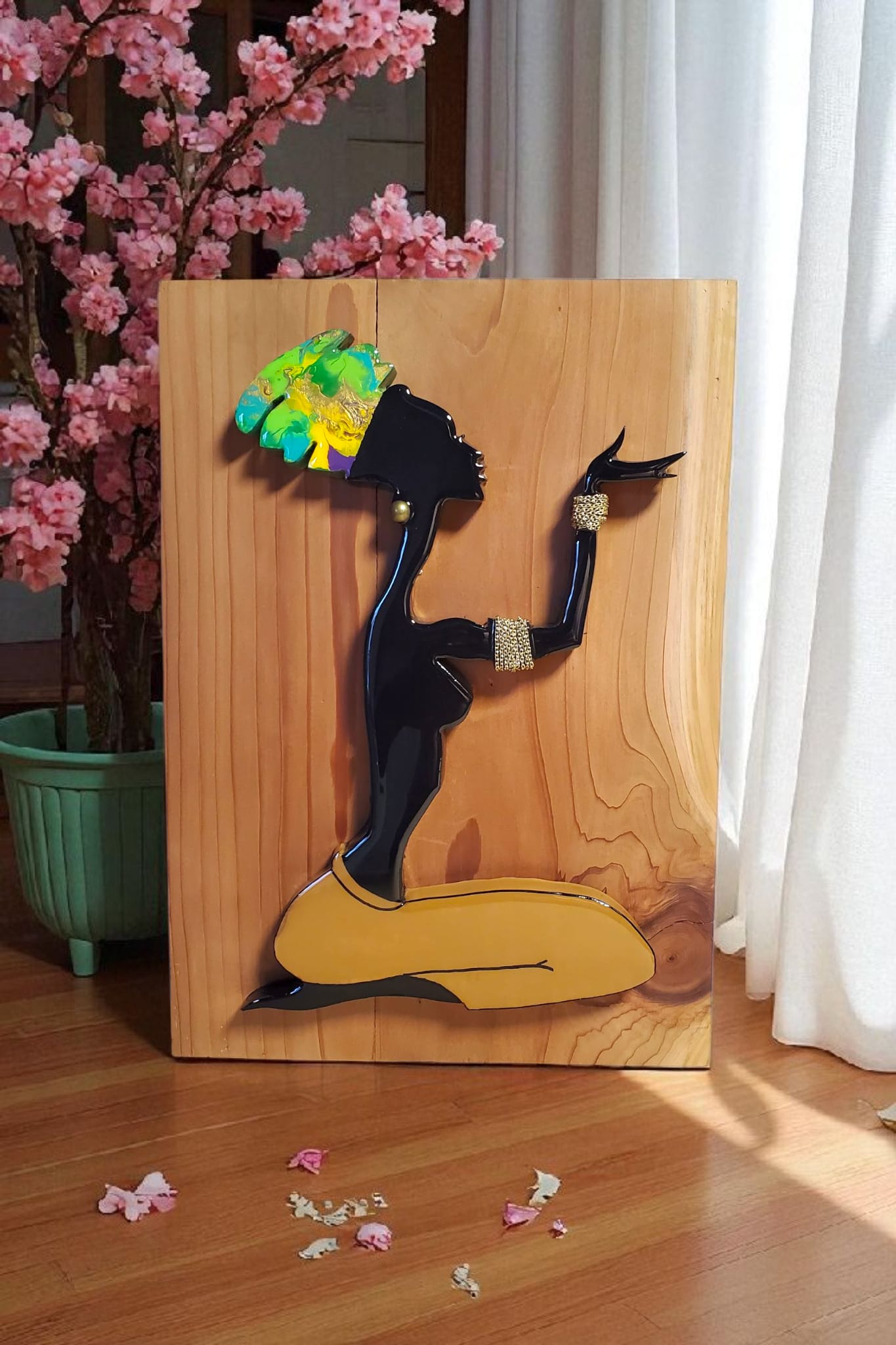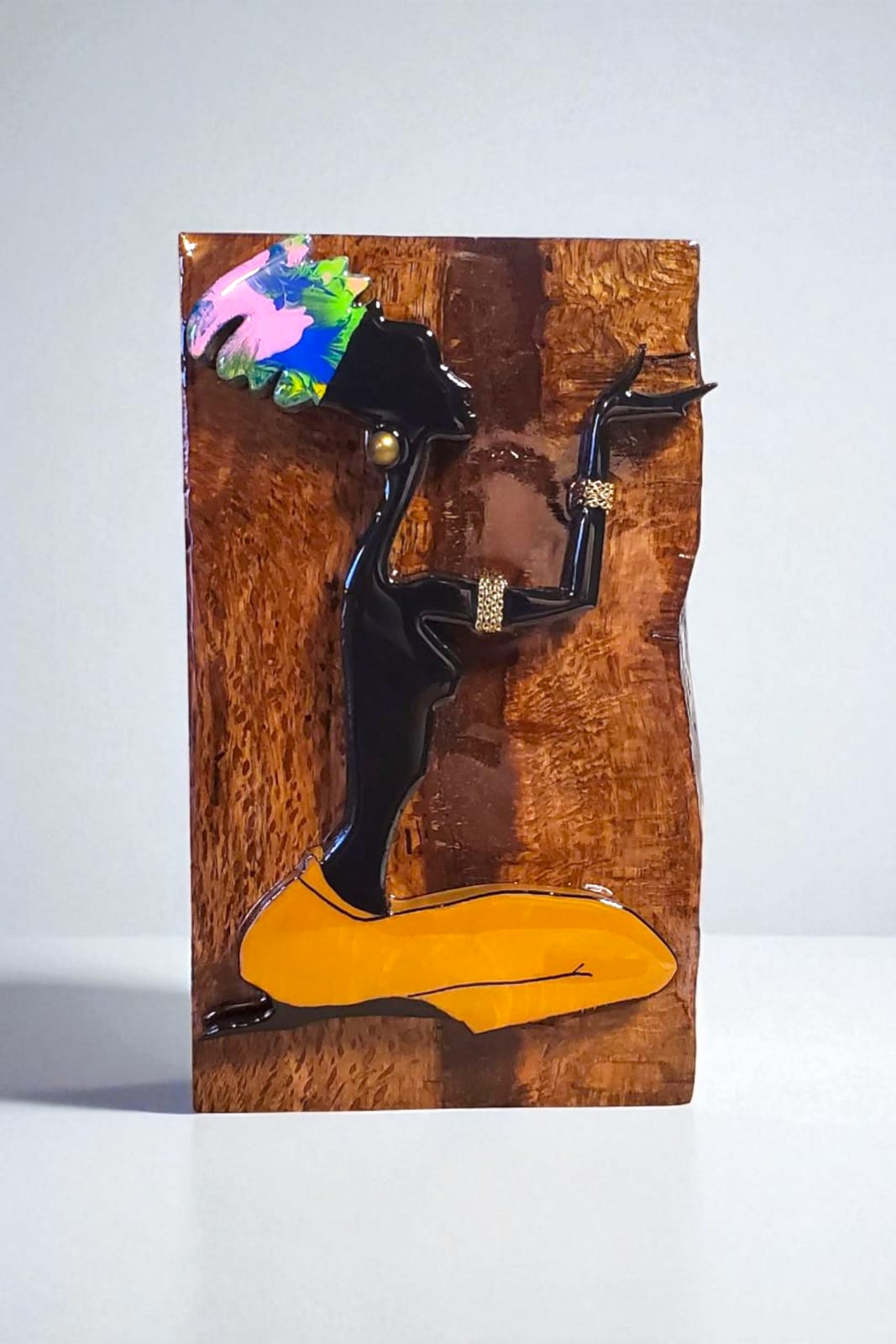 Escultura en bajorrelieve de 30×28 cm, con un peso de 9 La pieza representa a una mujer africana en actitud elegante, arrodillada y con la mano Extendida. Lleva en su cabeza un colorido tocado y, como adornos, arete y brazalete dorados. La escultura está montada sobre una tabla de madera, resaltando la cálida textura natural del fondo, y lacada con resina epóxica, brindándole un acabado brillante.